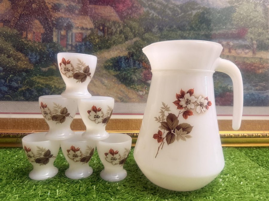Bình rót+ 6 ly hoạ tiết Arcopal Pháp cổ điển thập niên 60,70