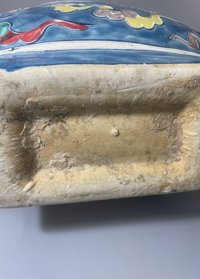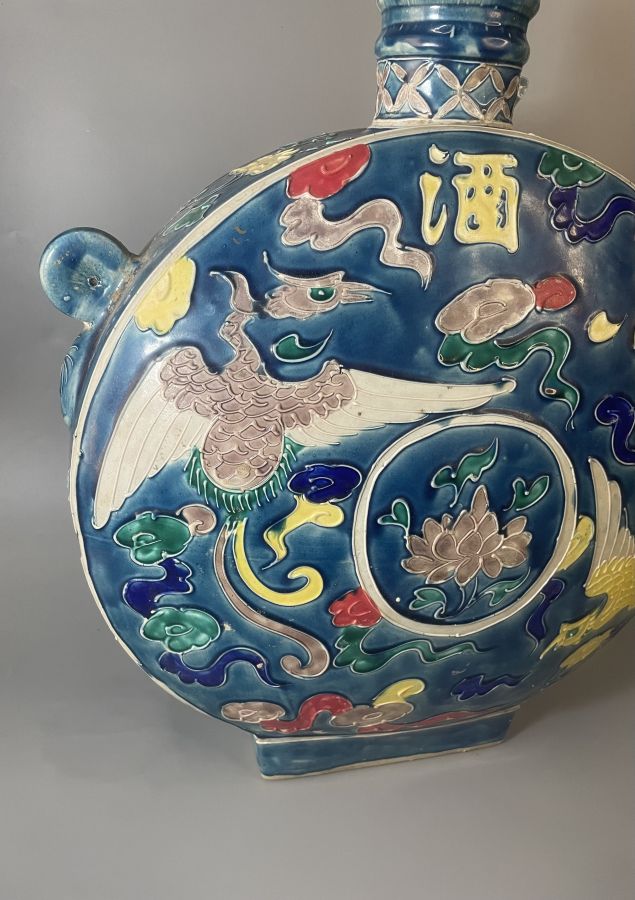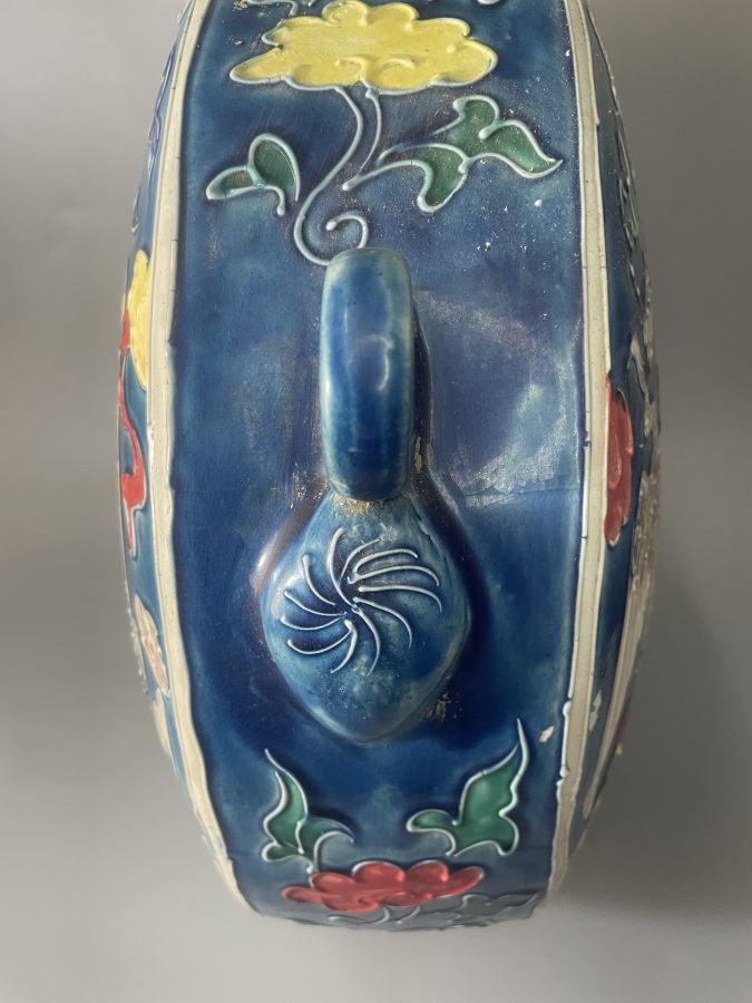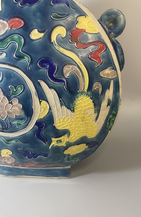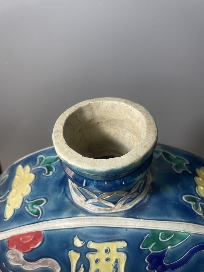 Mời Anh Chị xem 01 Bình đựng ******* tàu men Ngũ sắc dáng đồng hồ chạm khắc nổi đề tài Song Phụng lồng hoa cùng hoạ tiết tảng vân, minh văn….
