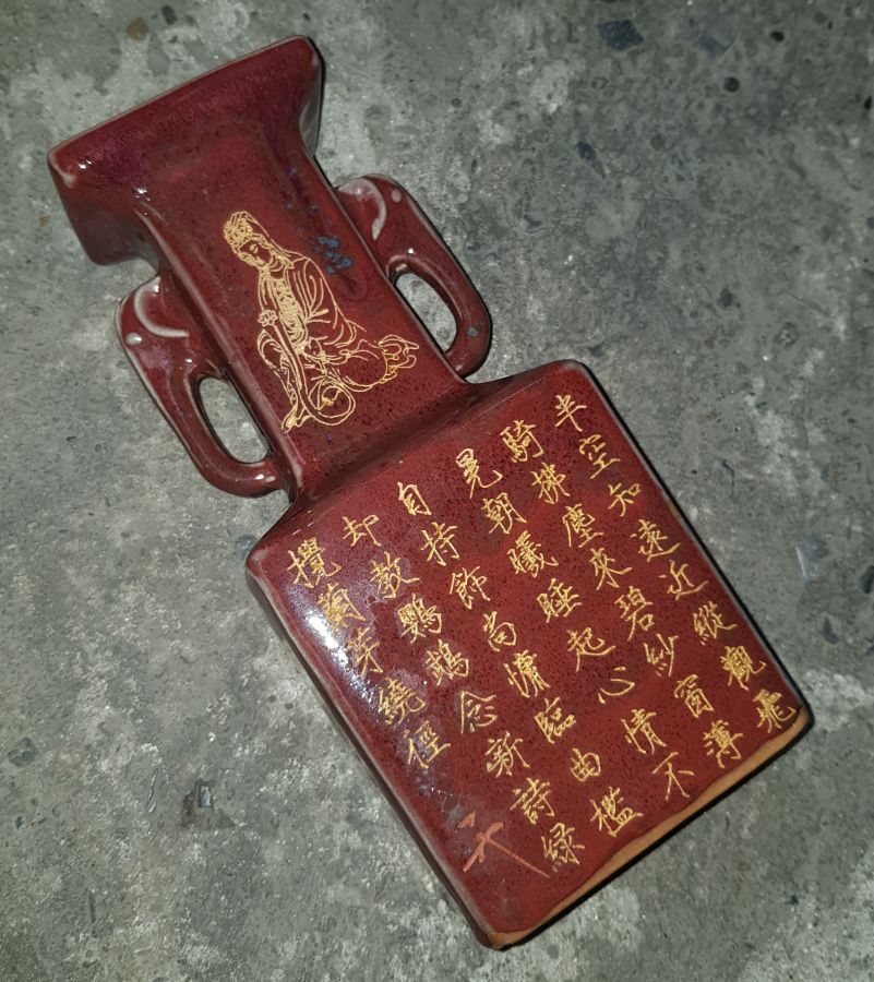 Bình men thúy hồng dáng vuông tứ diện khắc nhân vật và thứ pháp vàng. Bình cao 23.5cm. vuông miệng 6x8cm. vuông thân 10.5x9cm. Lành lặn. GL2250k