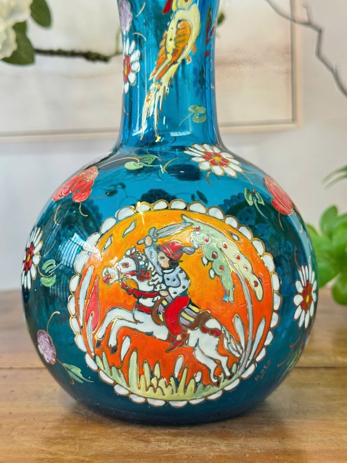 ➖ Màu nền lam ngọc phối cam lửa, đỏ son, trắng, xanh lá, chính là bảng màu đặc trưng của đồ pháp lam Isfahan (Iran).