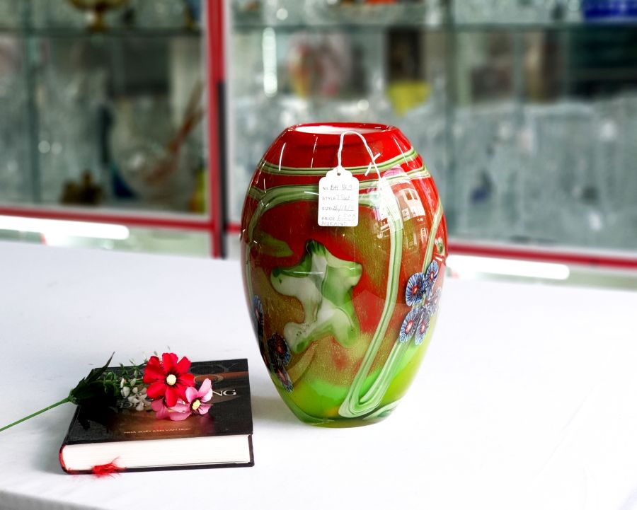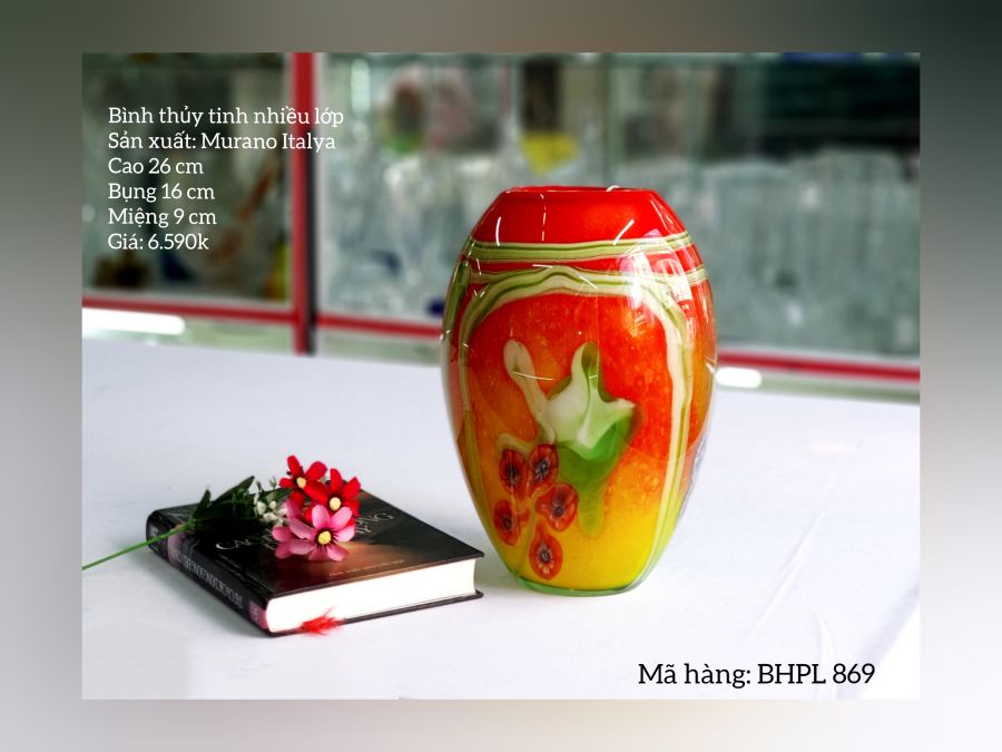 Bình thủy tinh Murano Italy nhiều màu: Đỏ cam, vàng, xanh tươi sáng.Chất liệu: Thủy tinh chất lượng cao.Màu sắc: Màu sắc phong phú