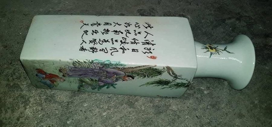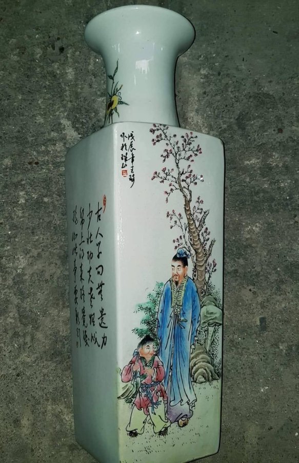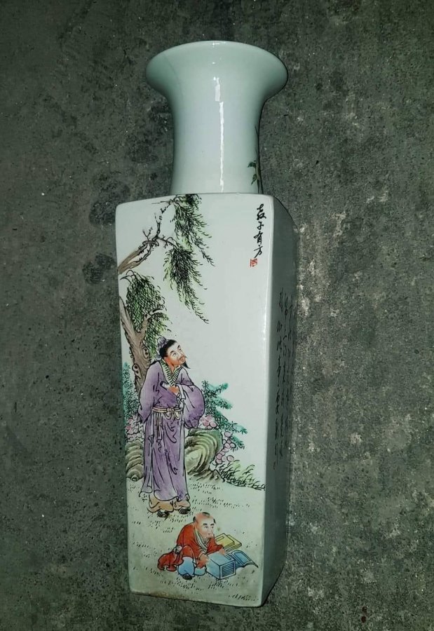 Bình vai vuông cổ tròn điển tích Tầm Sư Học Đạo có họa pháp và thư pháp sen kẽ. Vẻ đẹp của sứ nằm ở dáng vẻ duyên dáng của chúng với màu men đa dạng và ý nghĩa tốt đẹp được truyền tải qua đó. Bình vai vuông cổ tròn là loại bình rất khó làm với ý nghĩa một tư tưởng triết học trời tròn đất vuông.