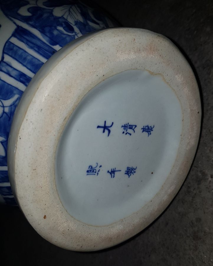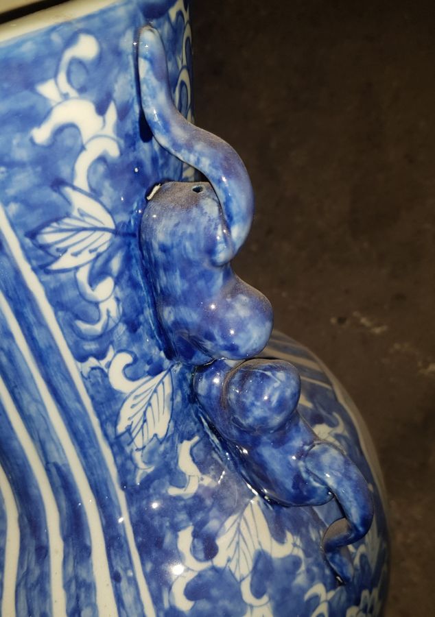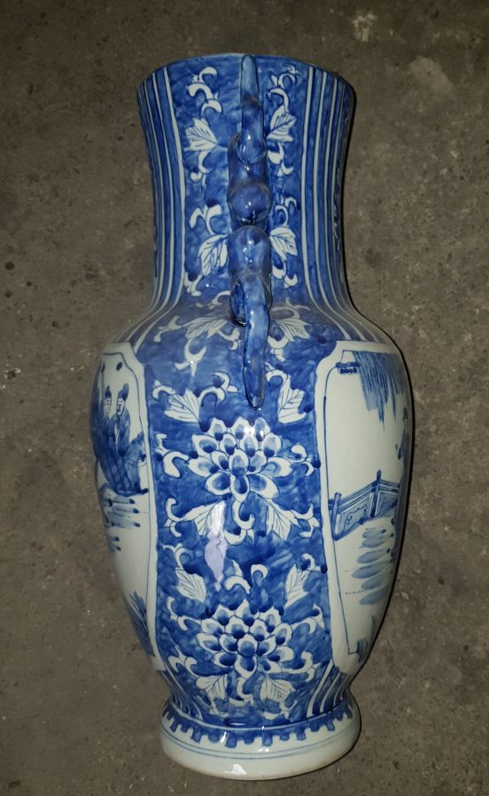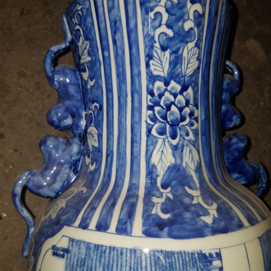Bình dáng lạ hiếm gặp cốt sứ đanh già , men lam chàm hồi họa pháp người cảnh thần thái. có 2 tai là nhị lân.Bình cao tổng thể 41cm. miệng 12.5cm. vòng bụng 65cm. lành lặn. GL2550k