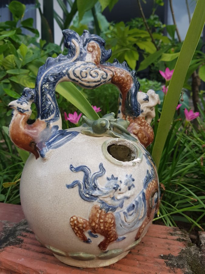 Bình vôi gốm Việt Nam xưa với các họa tiết được đắp nổi thủ công toàn chế. Bình vôi lớn với chiều cao 26cm. vòng bụng 51cm. lành lặn. GL1250k