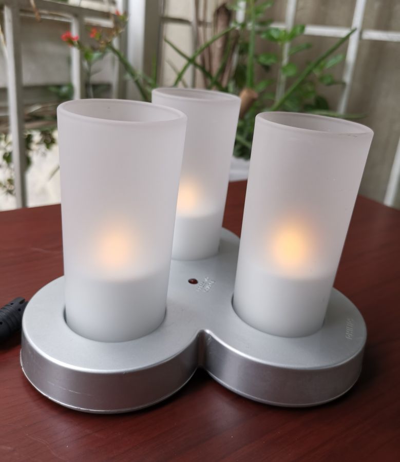 Bộ 3 nến điện cao cấp Philips Imageo. Cốc nến thủy tinh mờ, ánh nến rung rinh như thật. Nến xài pin sạc không dây cao cấp, thiết kế đóng kín, có thể rửa nước nếu cần. Bật và tắt nến bằng cách úp cốc.