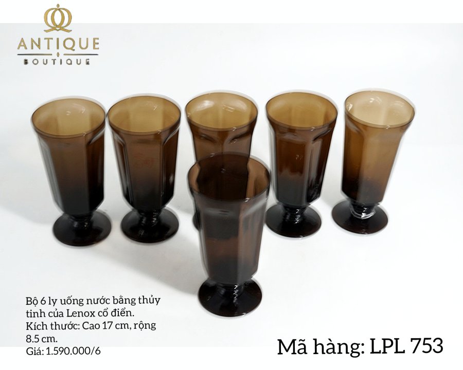 Bộ 6 ly uống nước bằng thủy tinh của Lenox cổ điển. Kích thước: Cao 17 cm, rộng 8.5 cm. Giá: 1.590.000/6