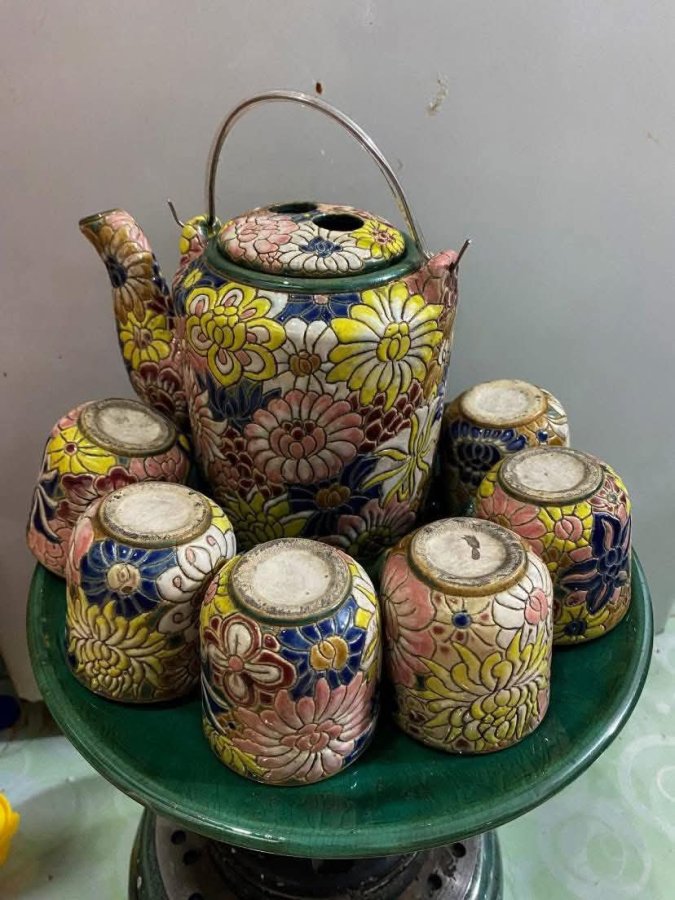 Bộ ấm trà gốm sứ đa sắc, họa tiết hoa văn tinh xảo.