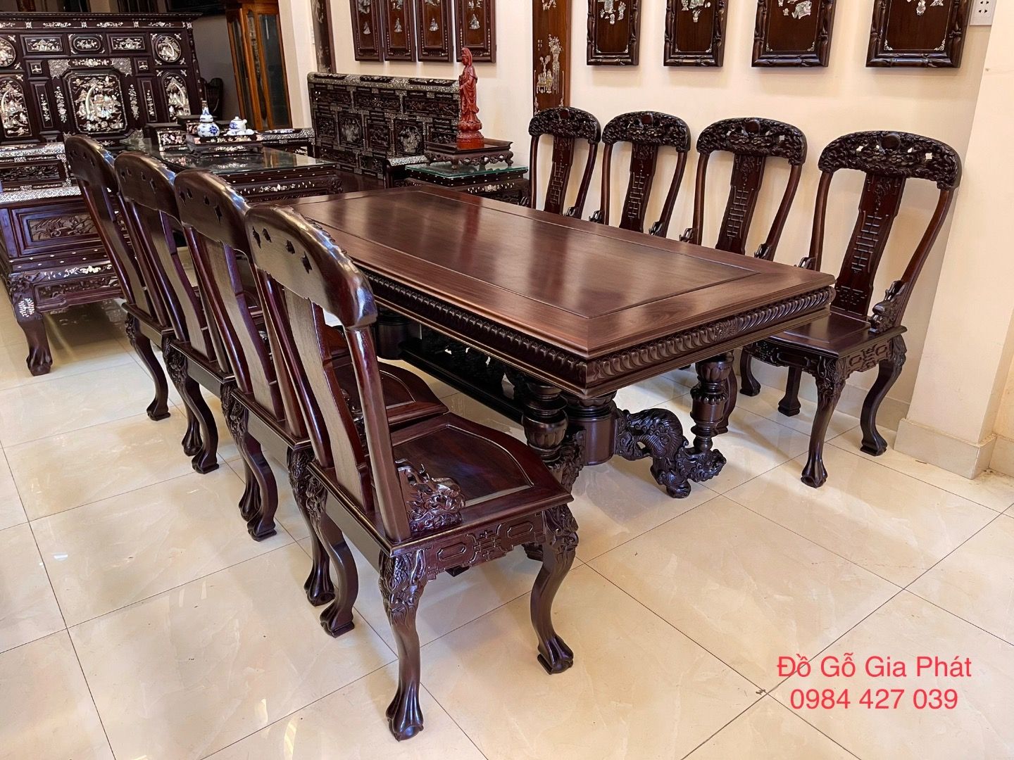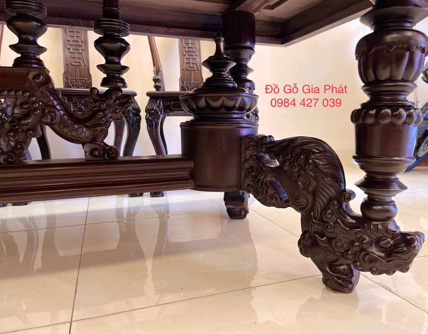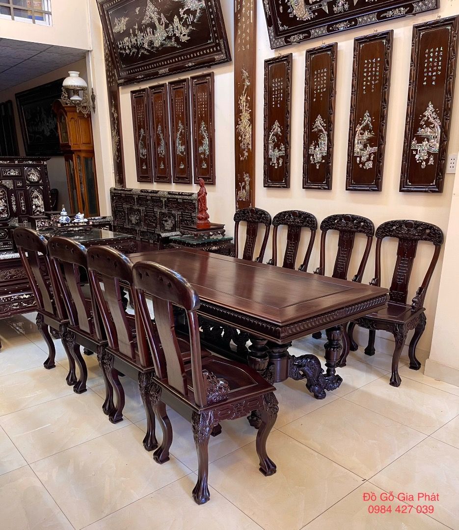 + Bộ bàn ăn kỳ lân 9 món: 8 ghế và 1 bàn dài chữ nhật mặt gỗ