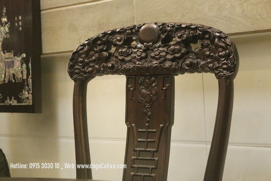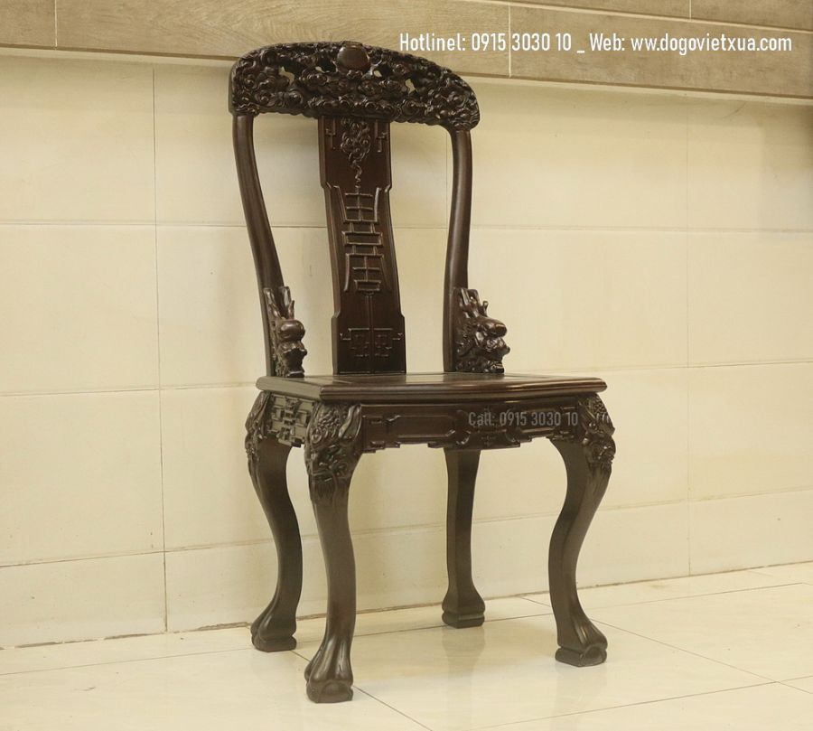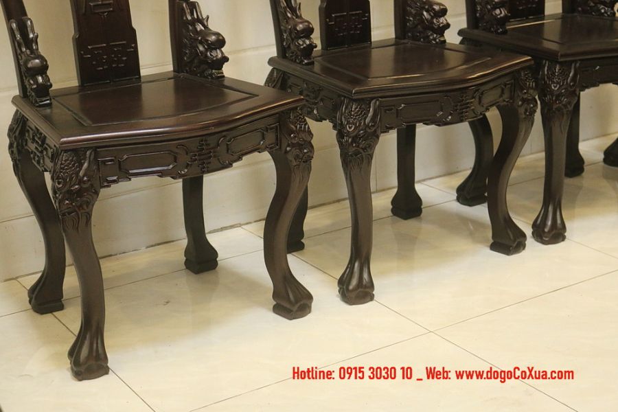 - 8 ghế đục chạm rồng: Mỗi chiếc ghế là một tác phẩm nghệ thuật, với phần tựa lưng được chạm khắc hình Rồng bay lượn – Biểu tượng của quyền lực sức mạnh trí tuệ và sự thịnh vượng, giúp công danh, sự nghiệp hanh thông.
