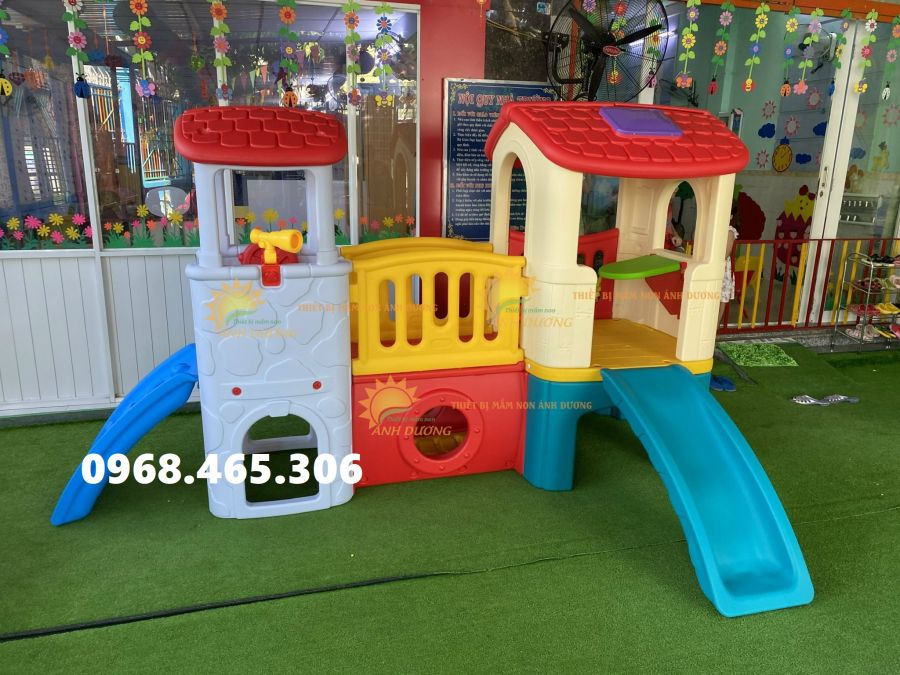 Tầng dưới (màu đỏ) làm đồ chơi đường hầm chui cho bé kiểu đường hầm có cửa sổ hướng ra phía trước. Tầng trên là một lối đi như hành lang với lan can 2 bên nối 2 khối nhà với nhau bằng khớp nối cứng.