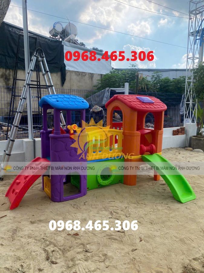 Tầng dưới (màu đỏ) làm đồ chơi đường hầm chui cho bé kiểu đường hầm có cửa sổ hướng ra phía trước. Tầng trên là một lối đi như hành lang với lan can 2 bên nối 2 khối nhà với nhau bằng khớp nối cứng.
