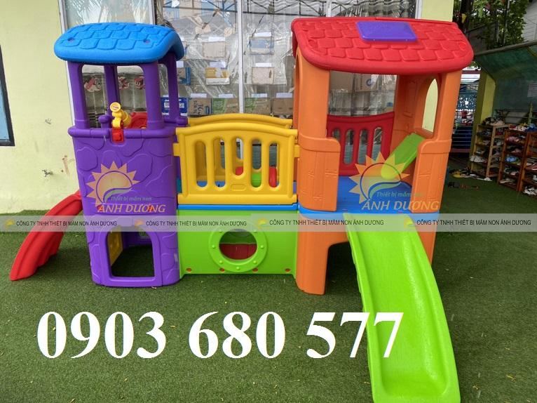 Bộ liên hoàn cầu trượt 2 mái nhà phù hợp với trẻ em trong trường mẫu giáo, khu vui chơi, công viên, sân chơi, nhà hàng, khách sạn, TTTM,…