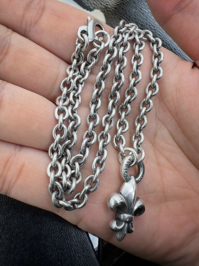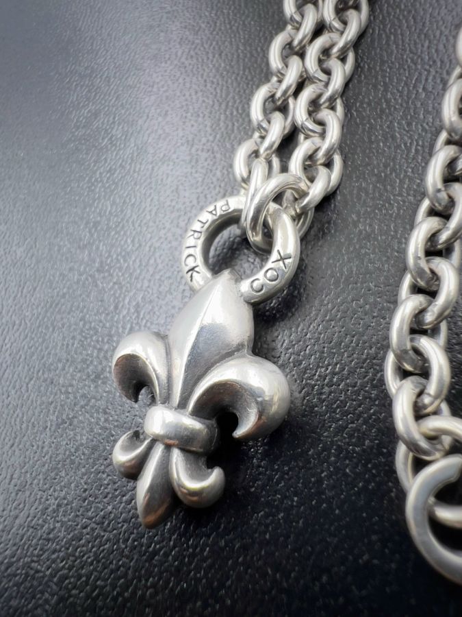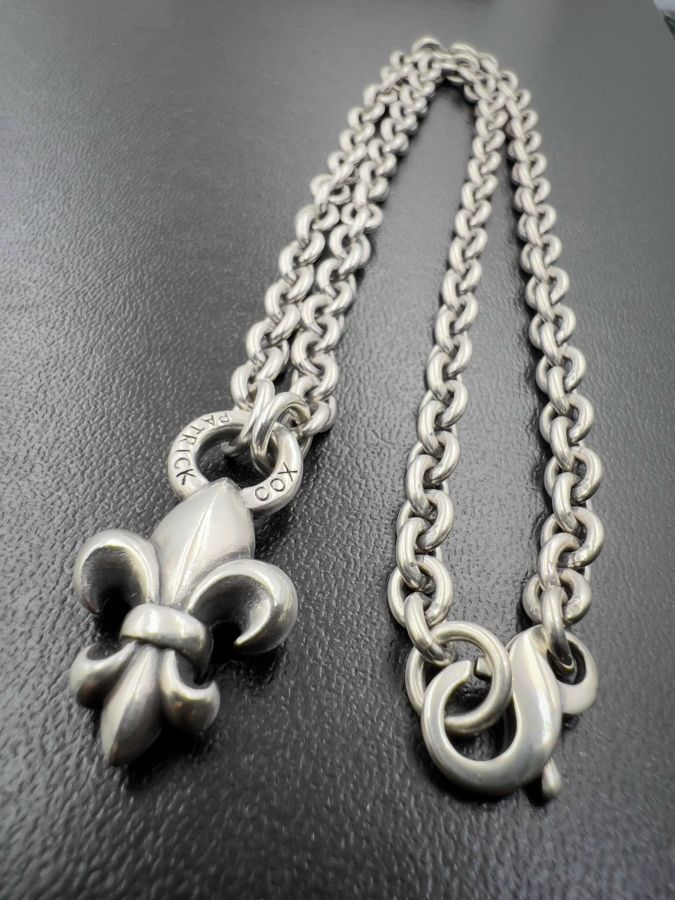 Bộ dây chuyền và mặt bạc 925 Nhật hiệu Patrick Cox hoa văn sắc nét rất đẹp, phôm bự, dây dài 46cm - ngang 5mm, mặt size 17x30mm, nặng 41.1gram (11 chỉ)