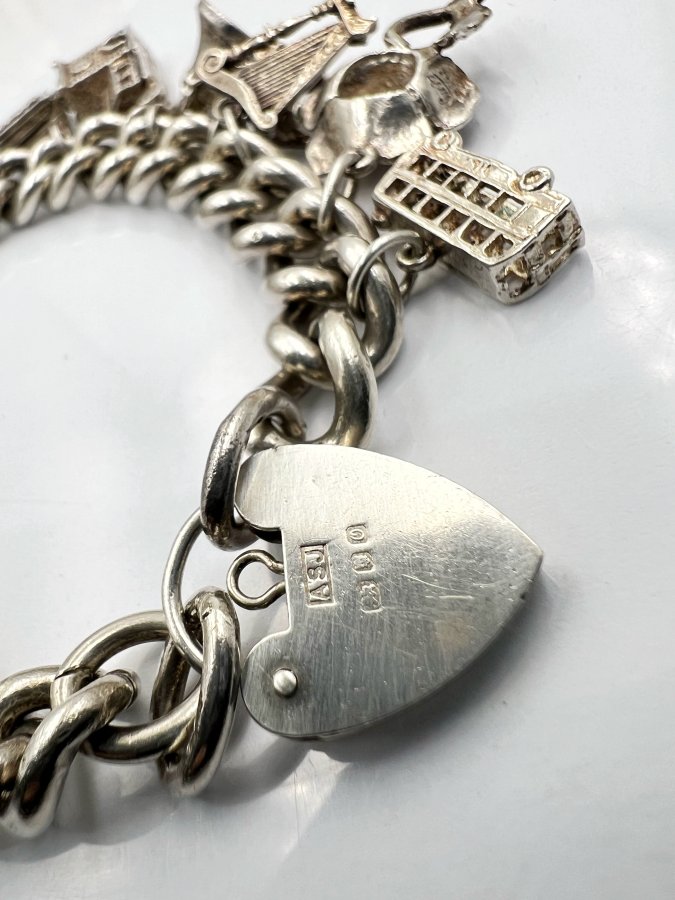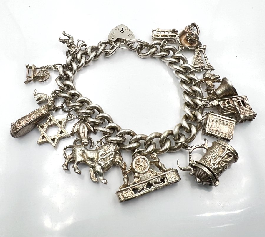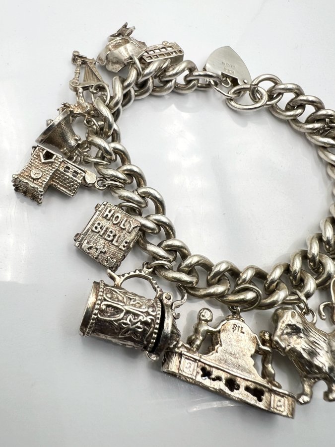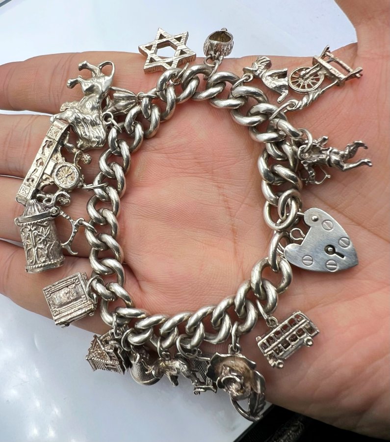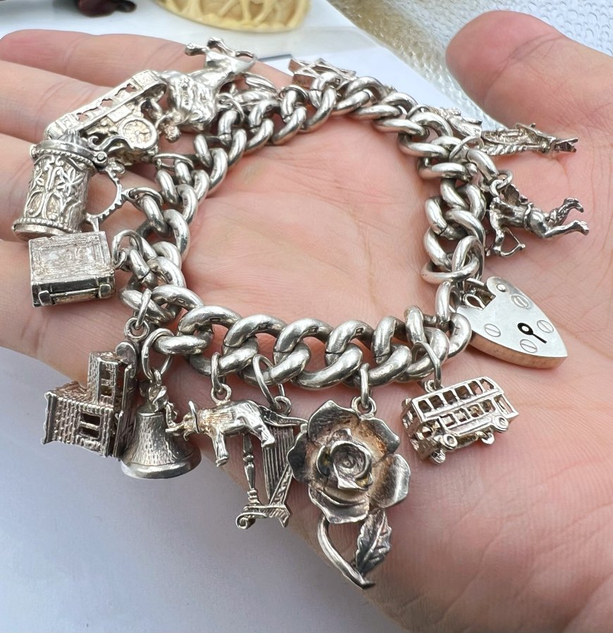Bộ dây lắc khóa trái tim và 16 mặt charm bạc 925 châu âu hiệu ASJ mới tinh hoa văn sắc nét rất đẹp, dây dài 18.5cm - bản ngang 10mm, nặng 81.58gram (21.75 chỉ), em giao lưu 8tr6❤️ Thiên 0923.12.6789