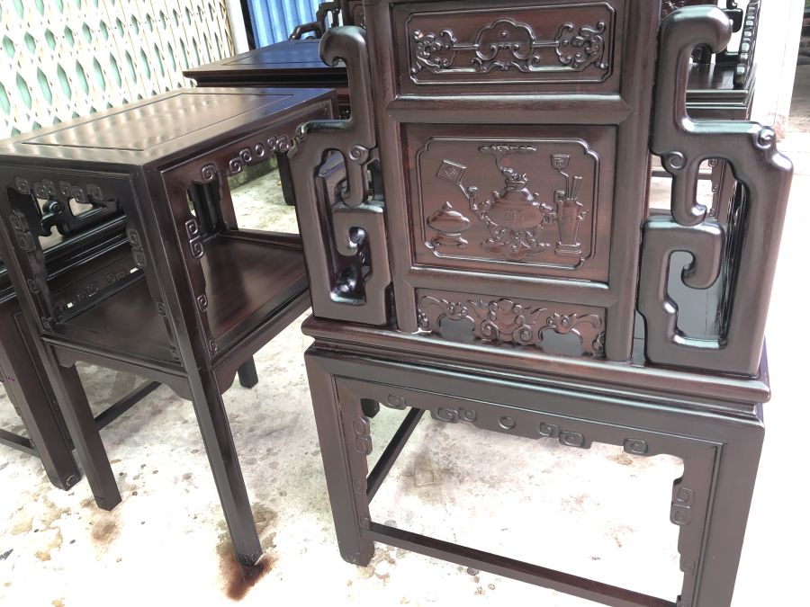 Bộ ghế vách móc truyện gỗ gụ gồm 7 món 4 ghế 1 bàn 2 kẹp