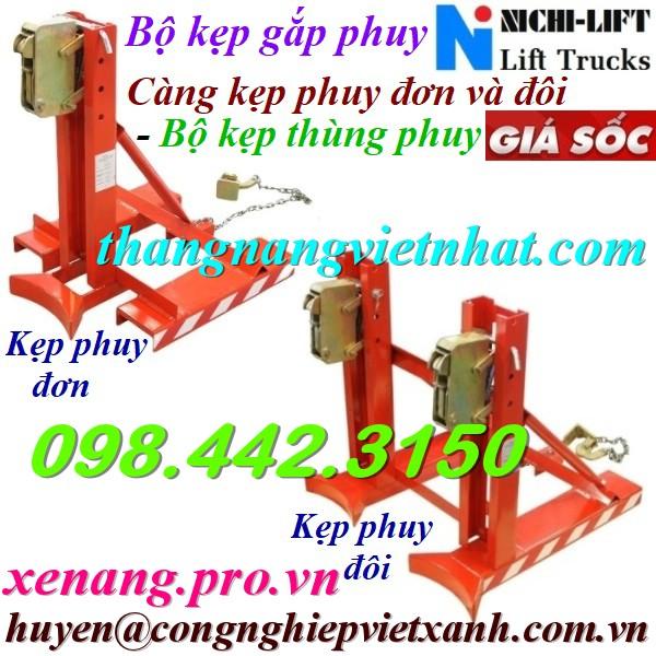 *. Bộ kẹp phuy đơn – Bộ kẹp phuy đôi hoạt động hoàn toàn tự động được móc vào 2 càng xe nâng động cơ và kẹp thùng phuy lên cao, có thể kẹp được cả phuy nhựa nếu gia cố được chắc chắn. Sử dụng dể dàng di chuyển linh hoạt cho quá trình nâng, hạ và xếp dỡ hàng hóa.