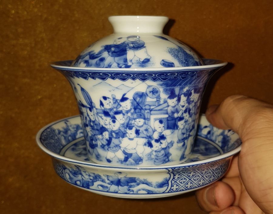 Bộ khải sứ men lam chàm hồi điển tích Bách Nhi đồ. Khải cao tổng thể 11cm, chén miệng 10.5cm.cao 5.5cm. đĩa đường kính 12.8cm. GL790k