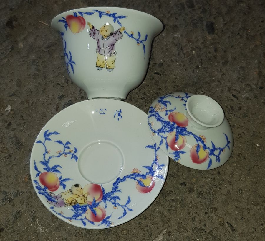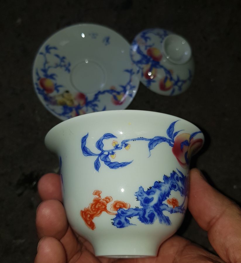 Bộ khải trà Tiểu Đồng hái đào chúc thọ đồ với nấm linh chi dưới gốc , thọ đào phía trên. có đề 2 chữ Thanh Tâm trong pháp trường sinh của Trương Tam Phong : Thanh Tâm - Quả Dục - Thủ Chân - Luyện Hình. Khải cao tổng thể 11cm. đĩa đường kính 11cm. chén miệng 9.7cm. cao 6.8cm. lành lặn. GL790k