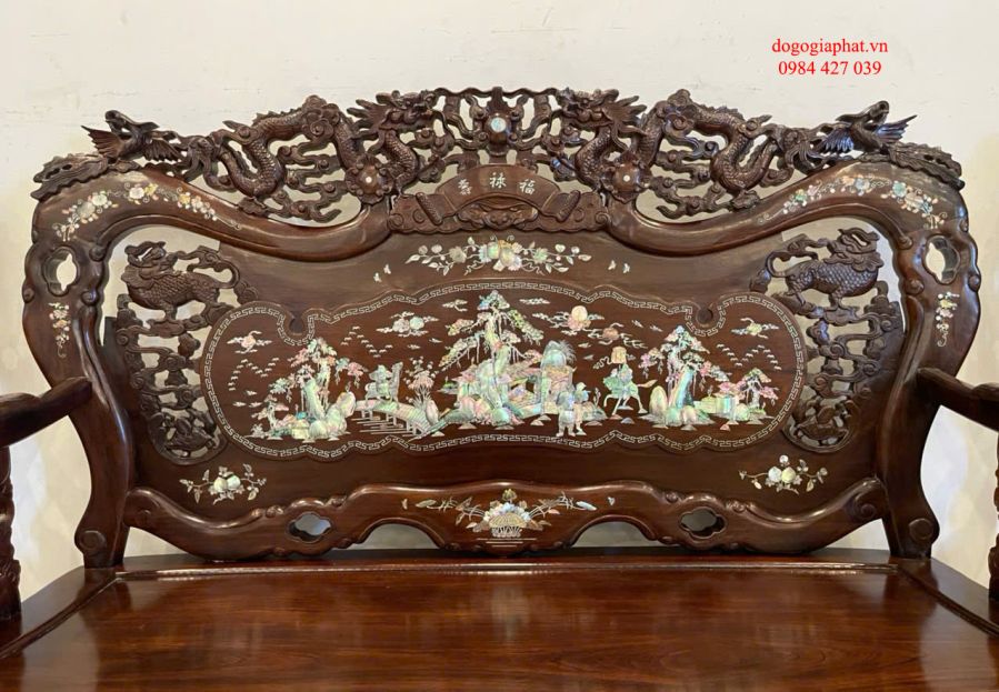 Bộ Khánh Rồng được chế tác từ gỗ quý, mỗi chi tiết đều được chạm khắc tinh xảo, mang đậm phong cách Huế xưa.