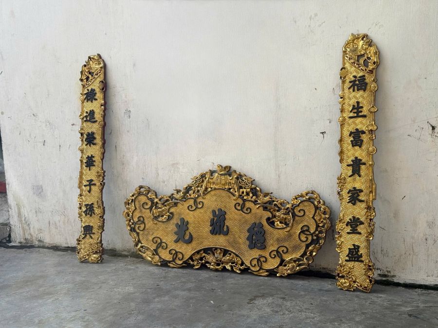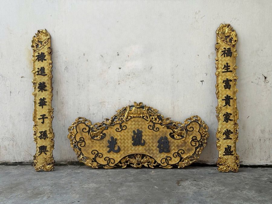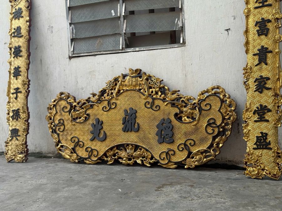 Giao lưu bộ khánh dơi đức lưu quang Kt : 1m27 x 60 x 4 Câu đối : 127 x 19 x 4 Dịch : phúc sinh phú quý gia đường thịnh Lộc tiến vinh hoa tử tôn hưng Gỗ dổi Giá 6 trieu800