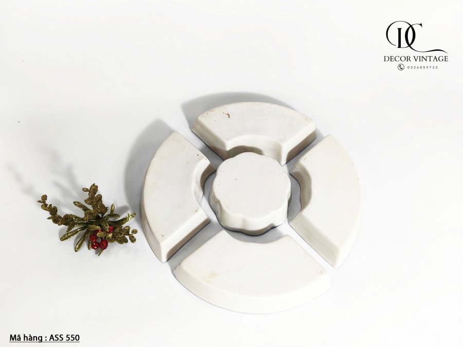 + Thiết kế: Bộ sản phẩm gồm 5 món (4 khay cánh quạt bao quanh 1 hũ tròn ở giữa), có thể tách rời hoặc ghép lại thành hình tròn hoàn chỉnh.