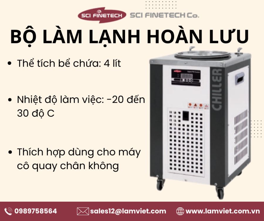 Bộ làm lạnh hoàn lưu thích hợp dùng cho máy cô quay chân không, được sản xuất bởi Sci Finetech - Công ty sản xuất thiết bị thí nghiệm hàng đầu của Hàn Quốc với những mẫu mã được thiết kế đẹp, tăng sự thoải mái cho người thao tác.