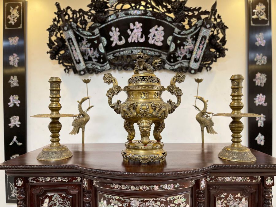 Một bộ lư đồng đẹp trưng trên bàn thờ không chỉ thể hiện sự tinh tế của gia chủ mà còn thể hiện lòng thành kính của con cháu đối với tổ tiên.