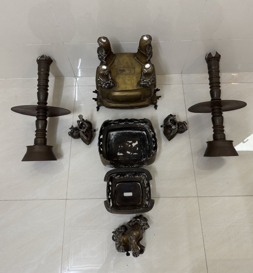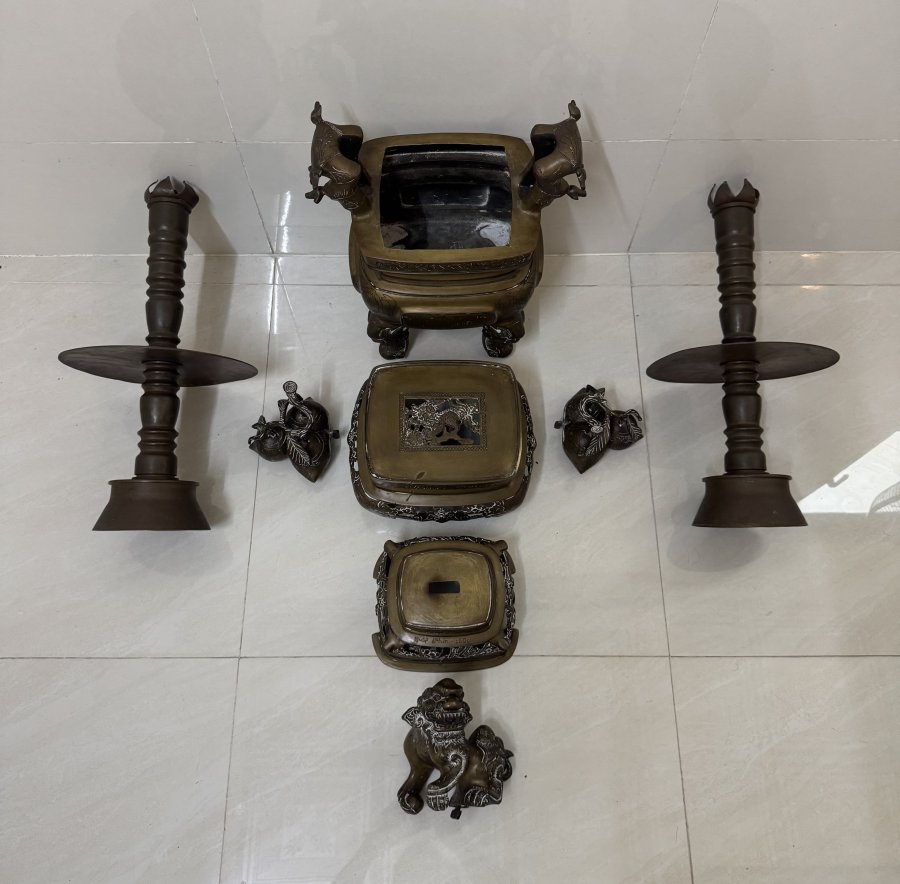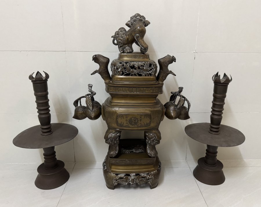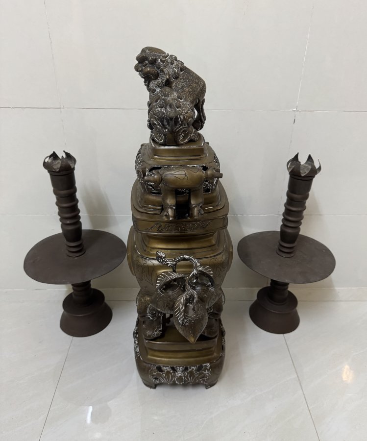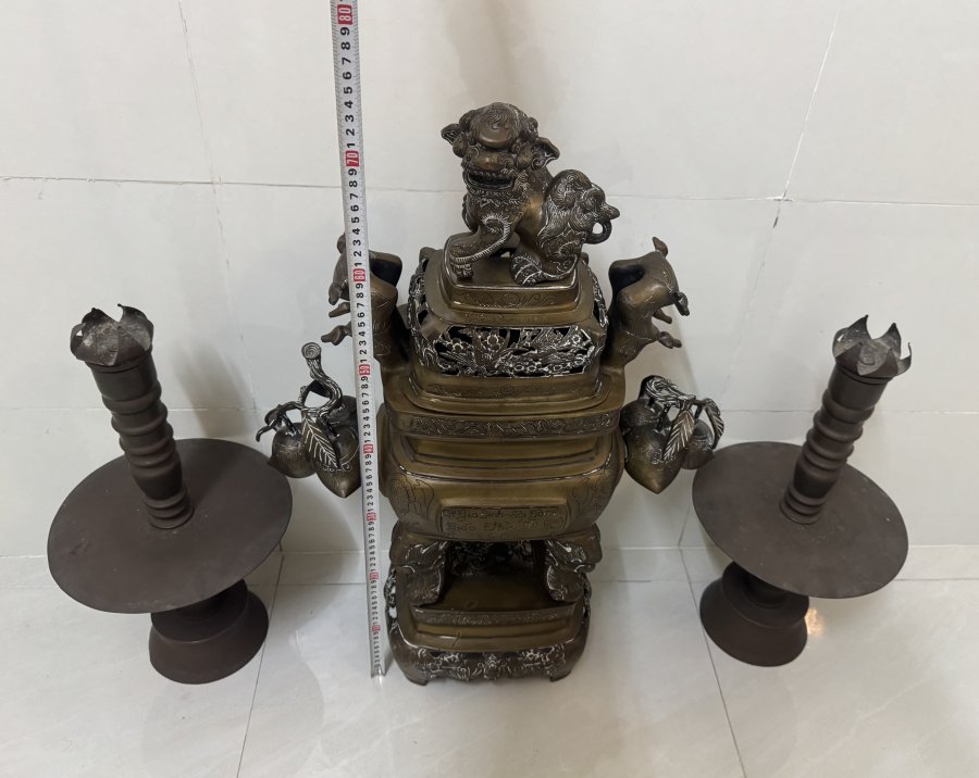 Lư cao 75cm, cả bộ nặng 26,5kg, cặp chân đèn nặng 7kg, cặp đào nặng 3kg, lân nặng 2,8kg.