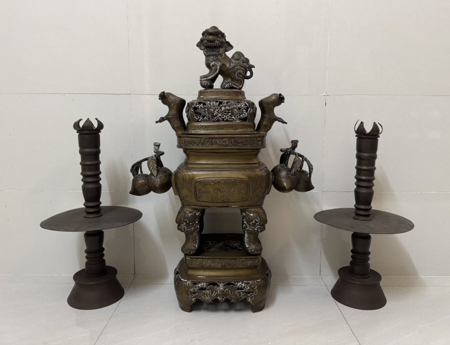 Bộ lư nhất trái đào chuẩn cổ 1904 Giáp Thìn nguyên zin lành đẹp, chạm hai mặt: Gia Định - Sài Gòn, Giáp Thìn 1904 & Phú quí bạc đầu, phu thê viên mãn.