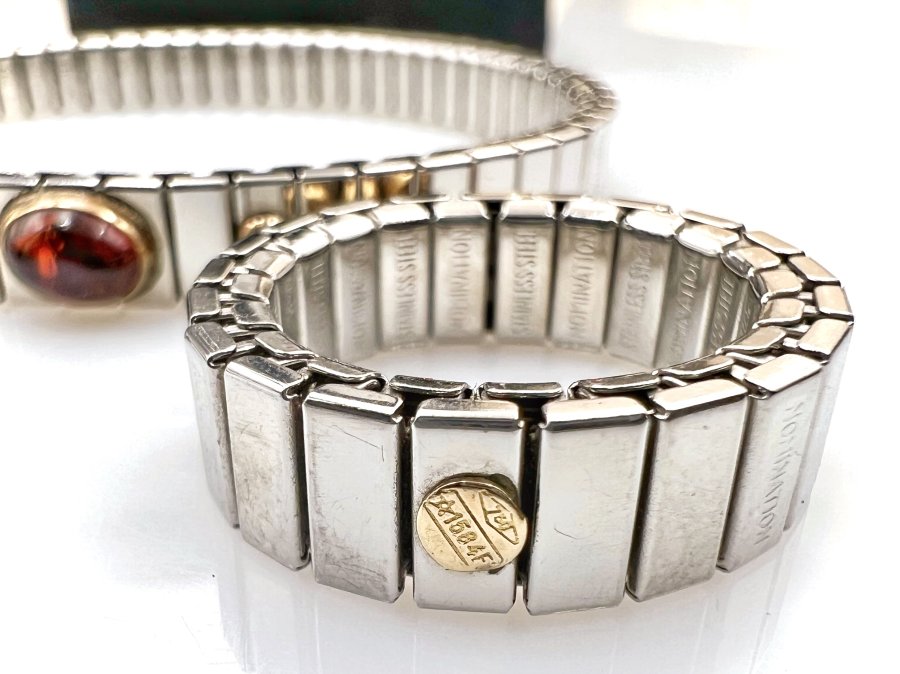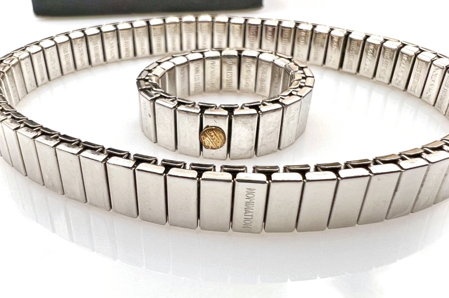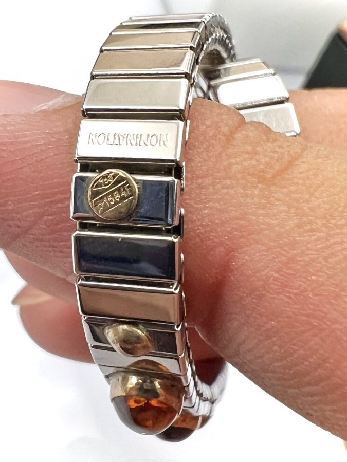 Bộ nhẫn và vòng hợp kim ốp vàng 18k hiệu Nomination mới tinh hoa văn sắc nét đính hổ phách thiên nhiên rất đẹp, còn hộp, nhẫn size 18mm - bản ngang 7mm, lắc dài 19cm, nặng 17.1gram (4.56 chỉ), giao thông 5tr6❤️ Thiên 0923.12.6789