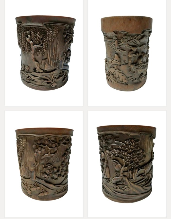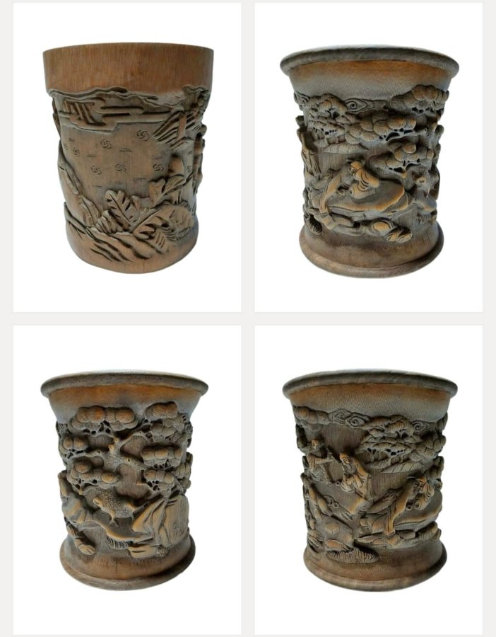 Thời nhà Thanh,tre chạm khắc cẩn thận với phong cảnh, nhân vật, câu chuyện,núi đá cao chót vót, thông bách hùng tráng, nhân vật biểu cảm tự nhiên,cả thể xác lẫn tinh thần, cốt truyện sinh động, chạm khắc chồng chéo có trật tự,lực dao sắc bén nhanh nhẹn,biểu cảm,thần thái...
