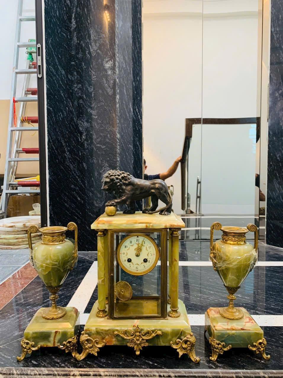 1 bộ sét 3 pháp cổ bằng đồng lake vàng kết hợp với dá cổ , mặt men bông, tuong su tử cực kỳ nét chay gông vòng hang cổ lòi