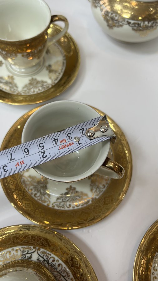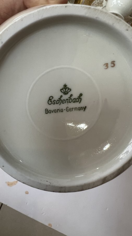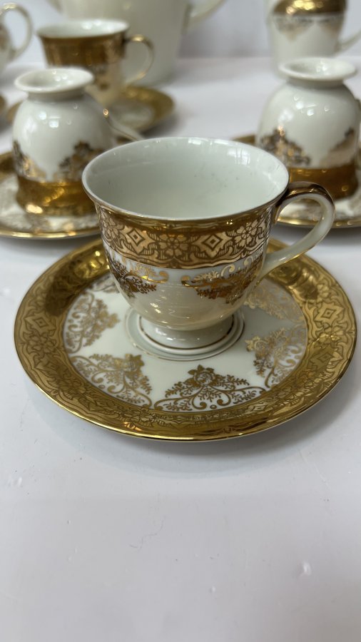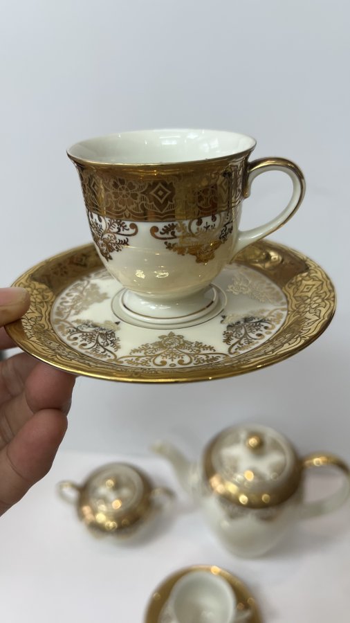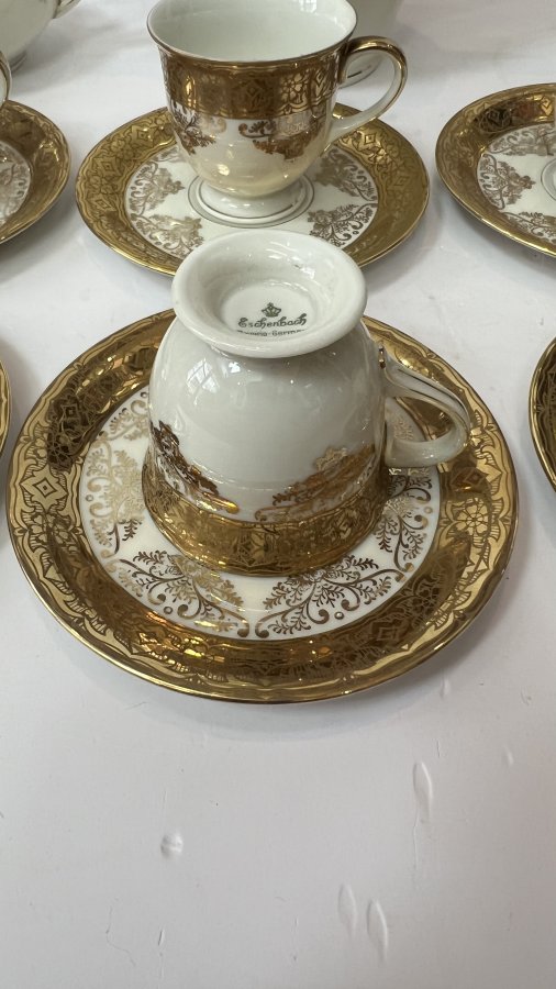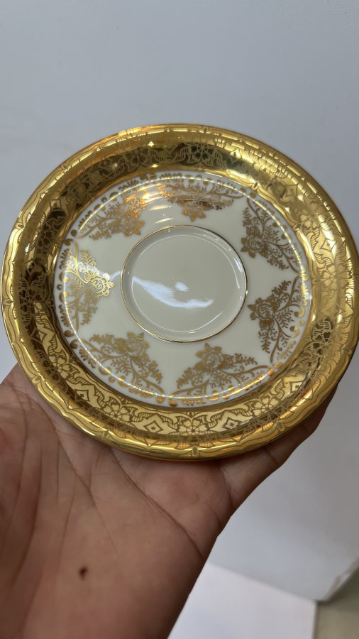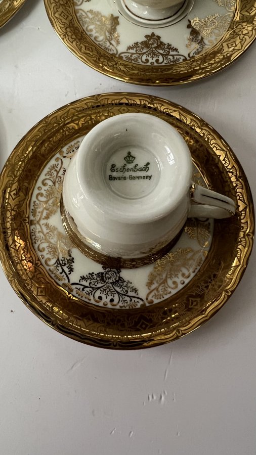 Bộ tách trà sứ của hãng Eschenbach, Bavaria-Germany. sx thập niên 1960. một thương hiệu Eschenbach, nổi tiếng về đồ sứ chất lượng cao tại Đức. Bộ tách và đĩa có họa tiết mạ vàng rất sang trọng.