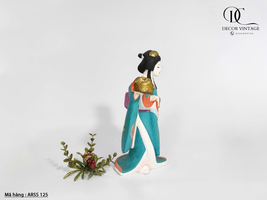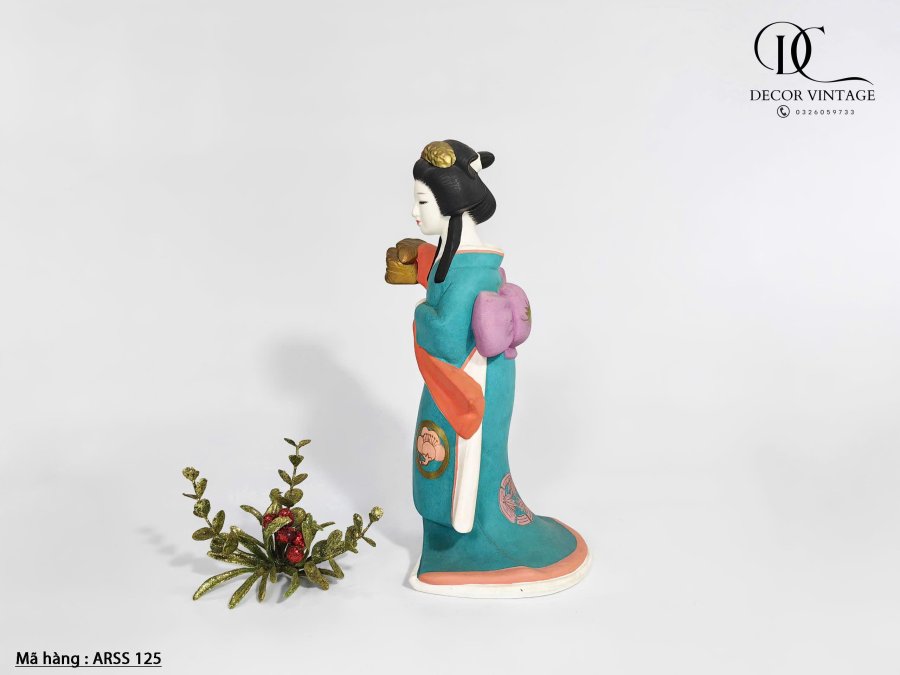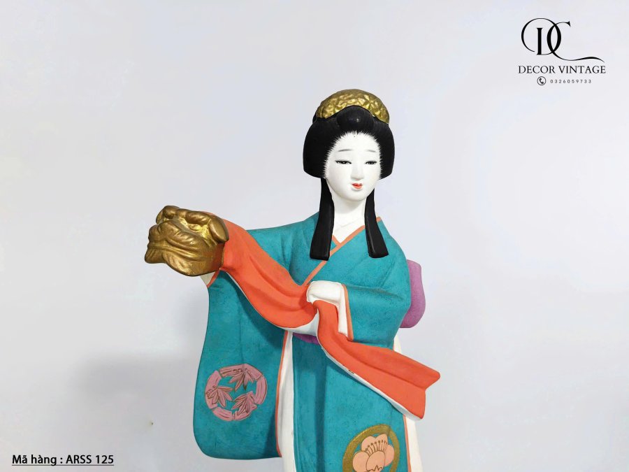 Hình vẽ tay không tráng men của một nghệ sĩ sân khấu Nhật Bản. Miêu tả một nghệ sĩ biểu diễn trong bộ kimono màu xanh ngọc lam sẫm được trang trí bằng hoa với viền màu cam và trắng, và nơ obi màu tím.