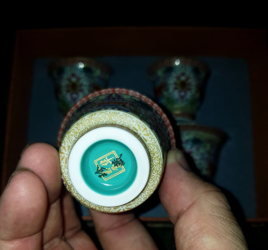 Bộ trà tam quân nhất tống vành miệng dát vàng trong lòng men hồ thủy ngoài vẽ hoa sen trên nền men gấm nổi. Cả bộ nguyên hộp rất đẹp và lành lặn. Chén tống có đường kính miệng 8cm. cao 5.5cm. chén quân có đường kính miệng 5.5cm. cao 4.5cm. GL1250k