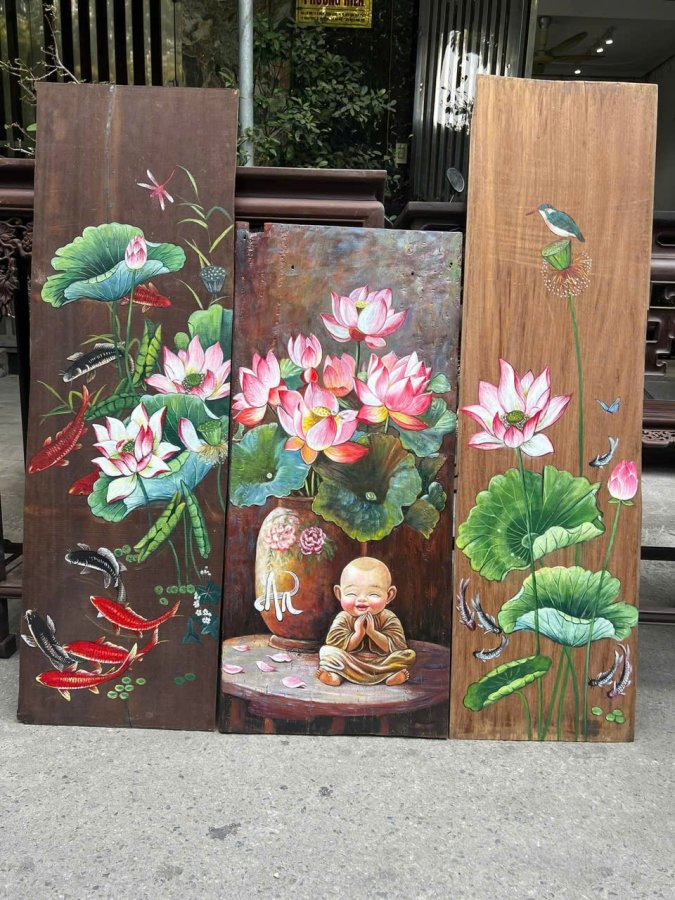 Bộ tran sơn dầu sen ca vẽ trên nền gỗ (ĐX - 135)