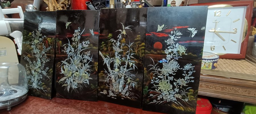 Bộ tranh tứ bình . Sơn mài khảm Mai Lan Cúc Trúc . Kích thước 29 × 59 cm/ bức , giá bán 650 k .