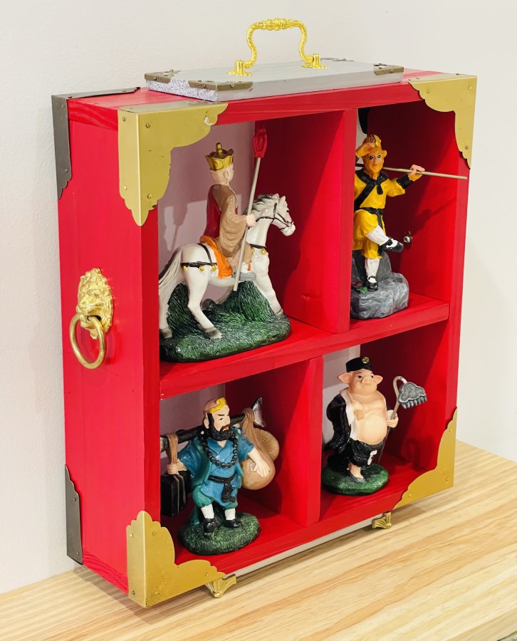 Bộ giá Deco Tượng “ Tây Du Ký “ 40/33cm 2 mặt nẹp họa tiết hoa văn đồng 2 màu,2 mặt cạnh gắn biểu tượng Hổ phù mạ vàng.Thầy trò Đường Tăng & Tôn Ngộ Không vi hành thỉnh kinh qua bộ phim TQ Tây Du Ký.Giá gỗ,tượng Composite thích hợp không gian Á Đông,quán ăn Trung Hoa 🇨🇳 Có thể vừa để bàn vừa treo tưởng theo không gian.