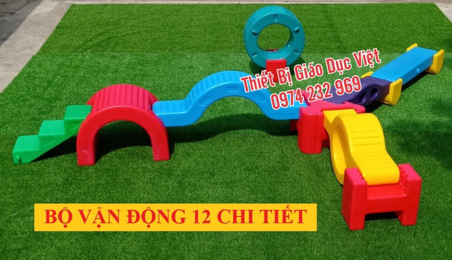 Bộ vận động dành cho trẻ em với 12 chi tiết. Bộ vận động này bao gồm nhiều khối vận động nhiều màu sắc như xanh, đỏ, vàng và tím, giúp trẻ em vui chơi và rèn luyện thể chất.