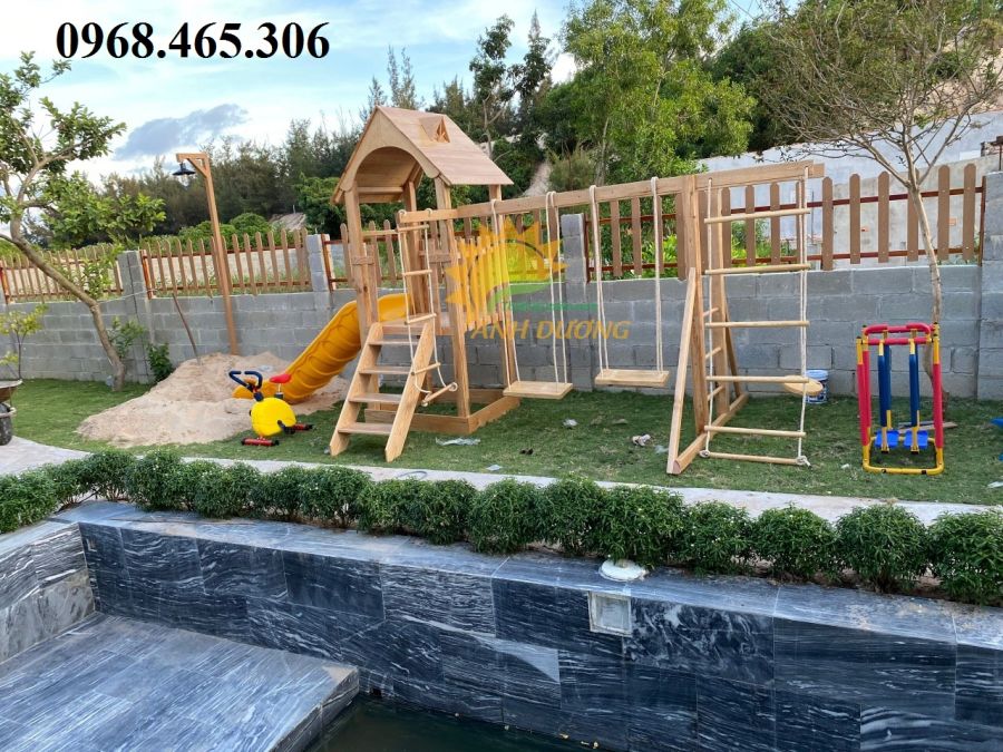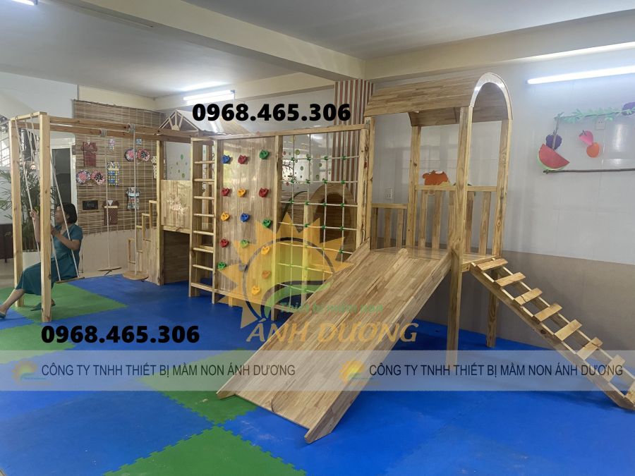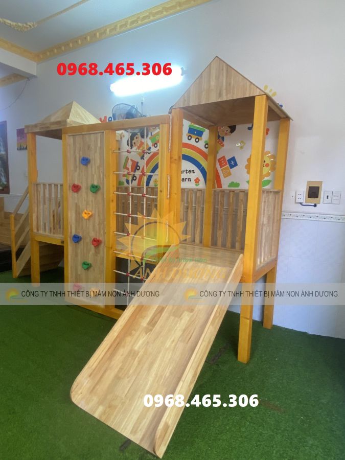 Khu vui chơi liên hoàn đa năng bằng gỗ với cầu trượt, mái nhà được làm hoàn toàn bằng gỗ kèm theo với bộ vận động thể chất đa năng cho bé, gồm các cầu trượt thẳng, bậc thang, và các thang leo cầu bò. Tất cả đều được làm bằng chất liệu an toàn cho bé.