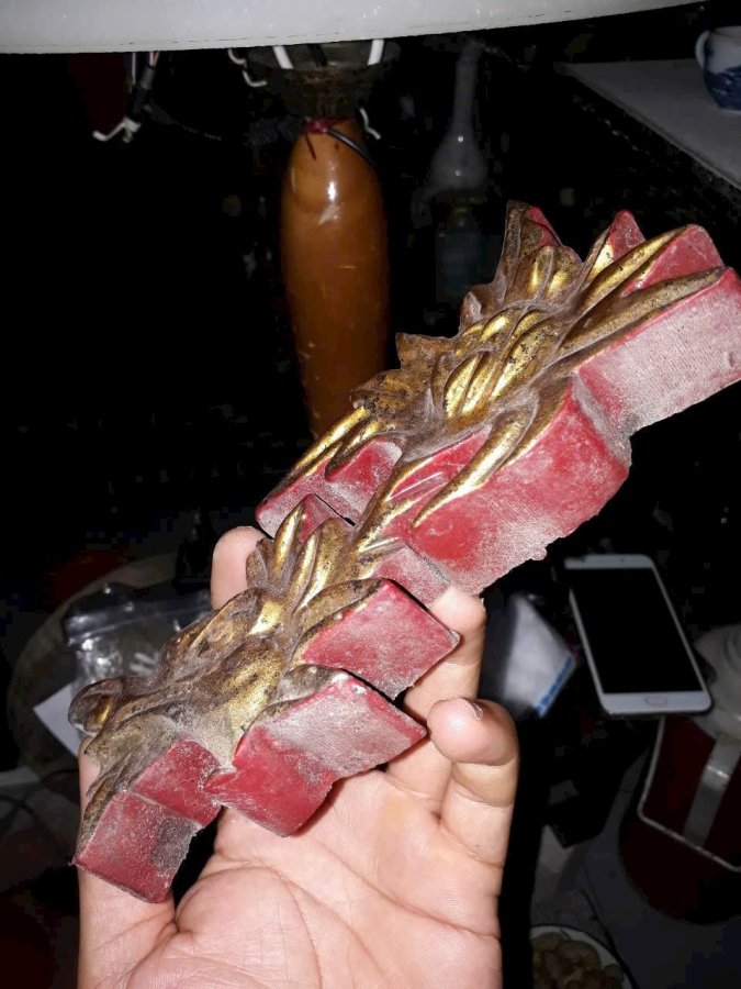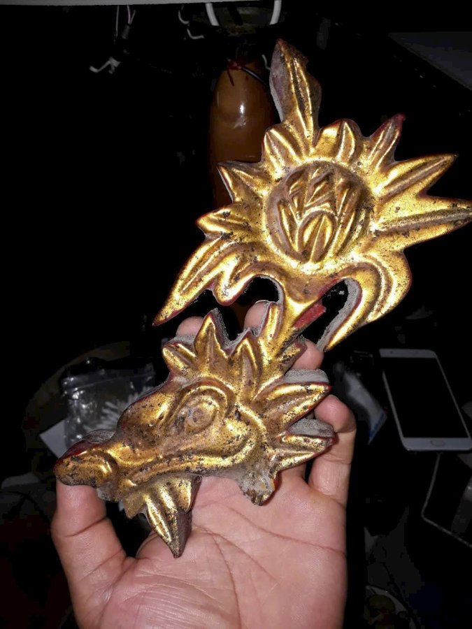 Bông hoa cúc hóa rồng, chất liệu gỗ mít sơn thếp vàng cổ. Cao 19cm, rộng 10cm, dày 2,3cm. Lành đẹp.