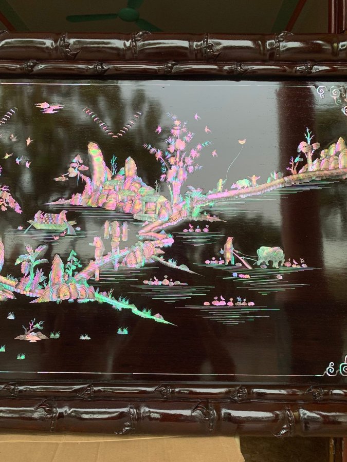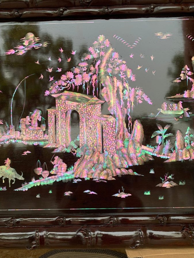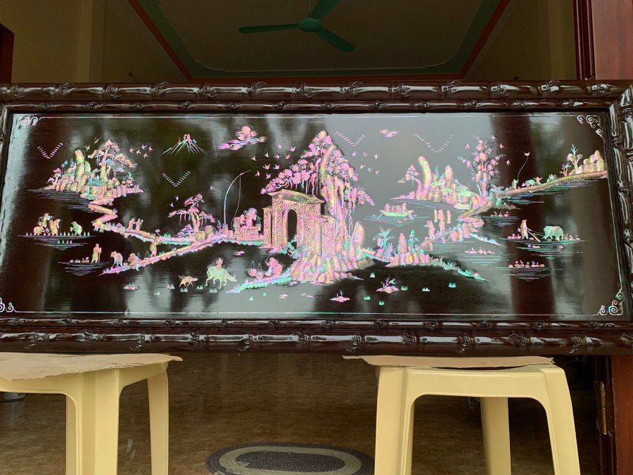 Bức tranh đồng quê khảm ốc đỏ lửa xà cừ cắt sắc nét kỹ thuật tinh tế 1m67x68