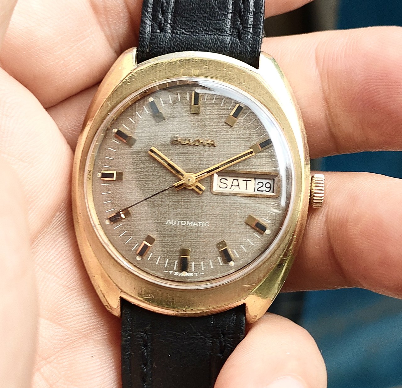 Bulova swiss Automatic, fom trứng vịt, mặt zin vân ca rô đẹp độc, máy vàng mới chạy ổn định và chính xác . Size 33x37. Tương đương 35 không đo núm