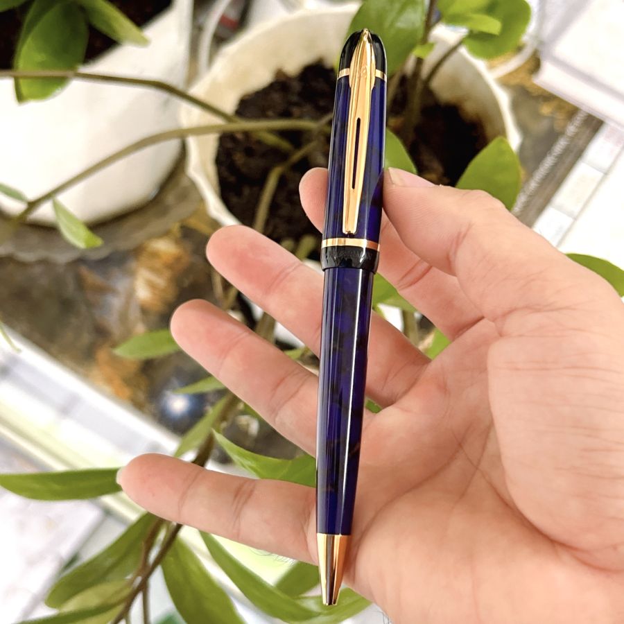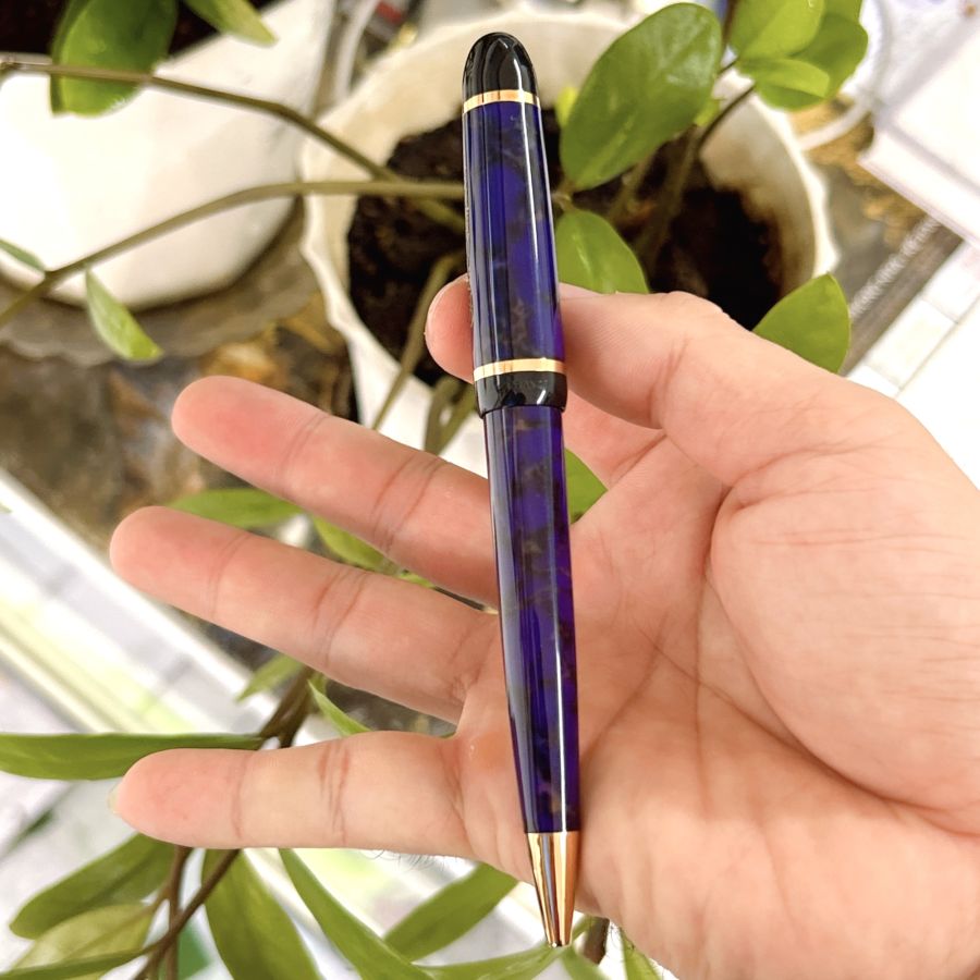 Bút Bi Xoay hiệu Waterman Paris chính hãng Pháp sản xuất nguyên zin 100% có hộp & cataloge đầy đủ. Toàn thân xanh đen vân đá cẩm thạch đờ mi vàng hồng tuyệt đẹp. Khoen cài vàng hồng có logo của hãng.