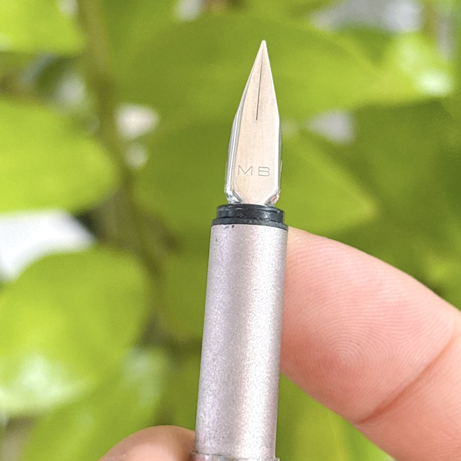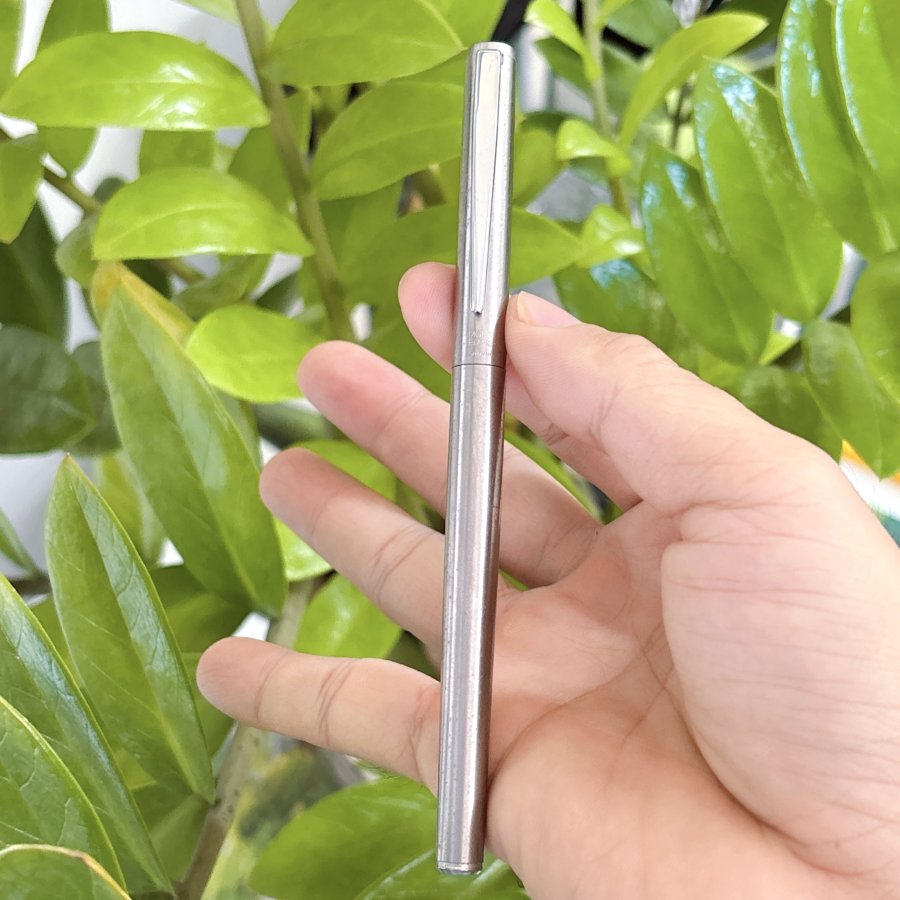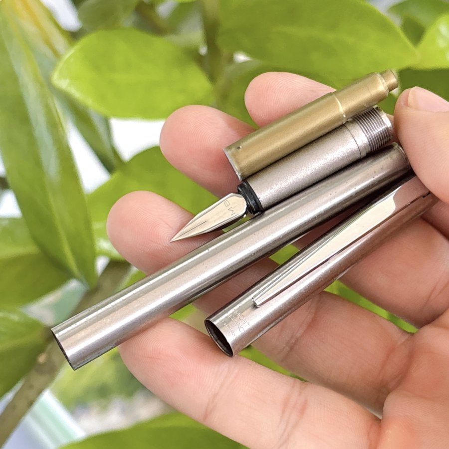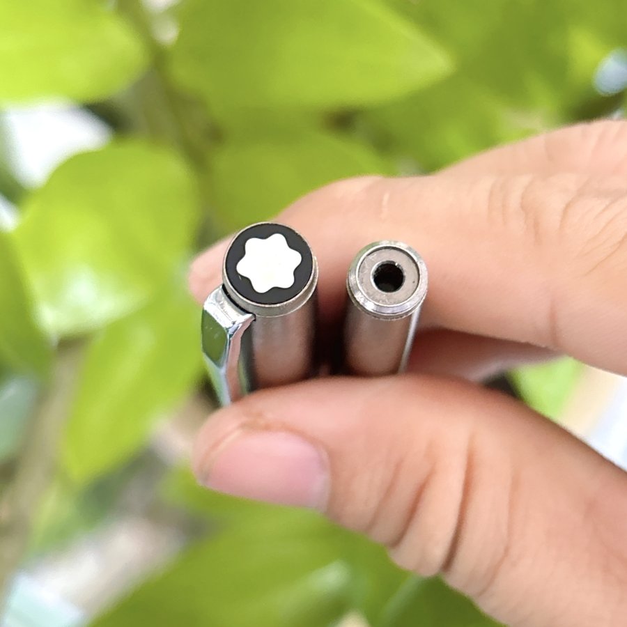 Bút máy hiệu Montblanc chính hãng Germany sản xuất. Toàn thân thép, khoen cài thép, trên thân bút có đóng hiệu Montblanc Gremany. Đình bút có logo "Bông Mai Trắng" đặc trưng của hãng. Ruột zin theo bút đính kèm.