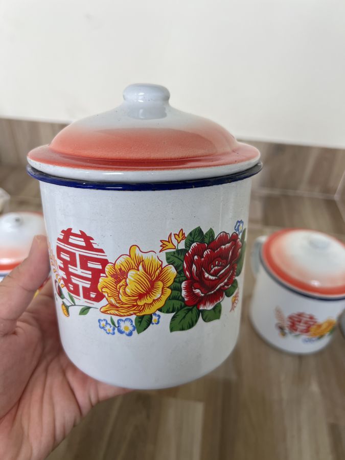 🌼Ca sắt tráng men hoa hồng Song Hỷ chuẩn xưa thời bao cấp.