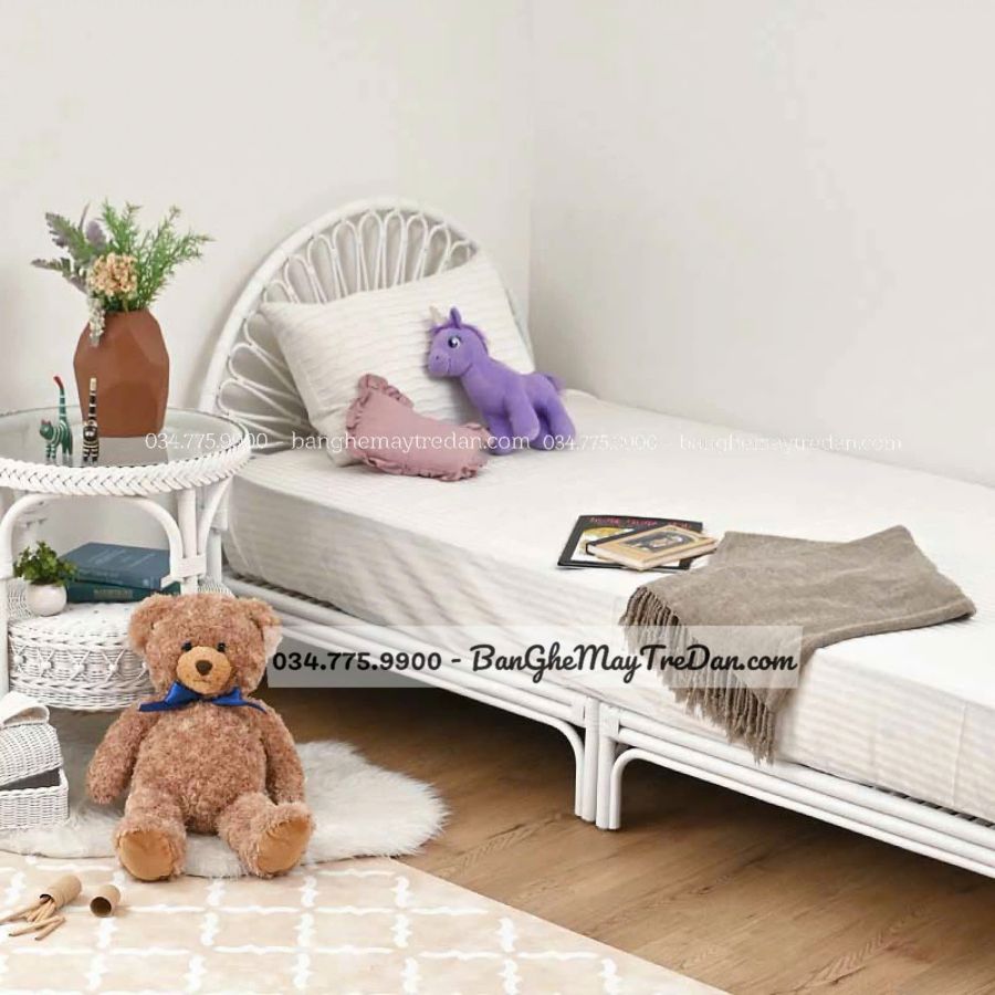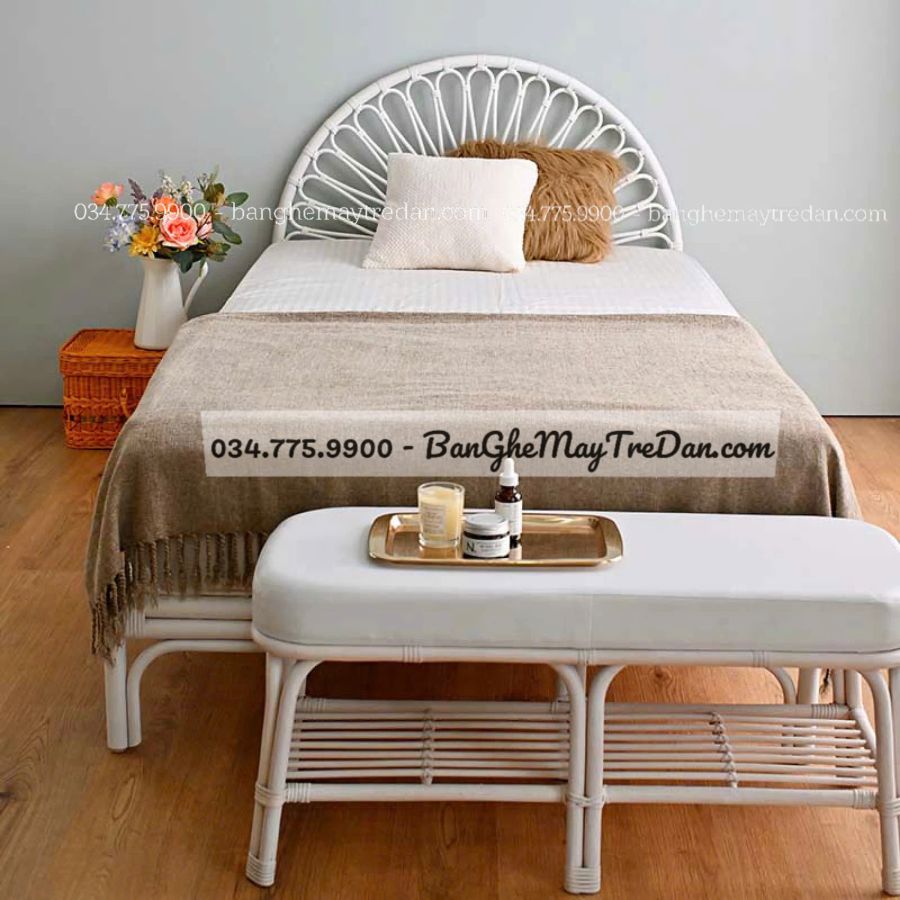 Kết hợp hài hòa với nội thất mây tre khác: Tủ đầu giường, gương treo tường tai thỏ, đèn mây tre,... tạo nên không gian đồng điệu, ấm cúng và sáng tạo.