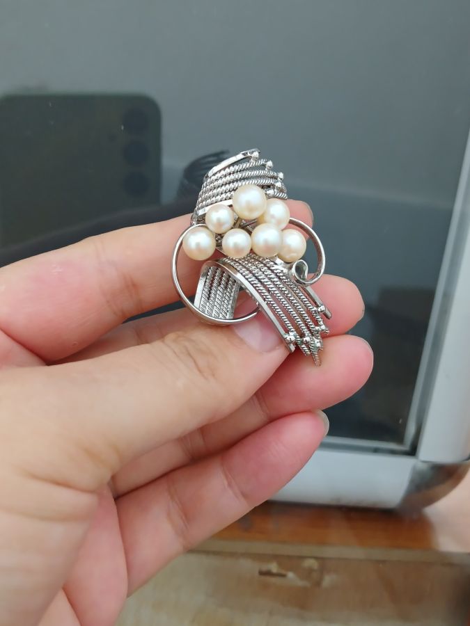 Cài áo đính 7 viên ngọc trai Akoya bóng đẹp.