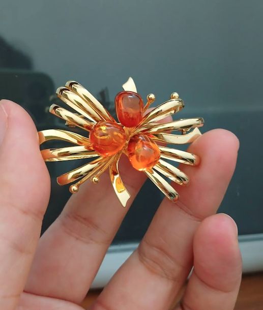 Cài áo Nhật khung mạ vàng, đính hổ phách nở hoa mới đẹp cực sang
