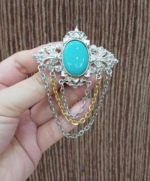 Cài áo si Nhật kiểu Vintage mạ bạc, đính đá xanh to đẹp rất sang